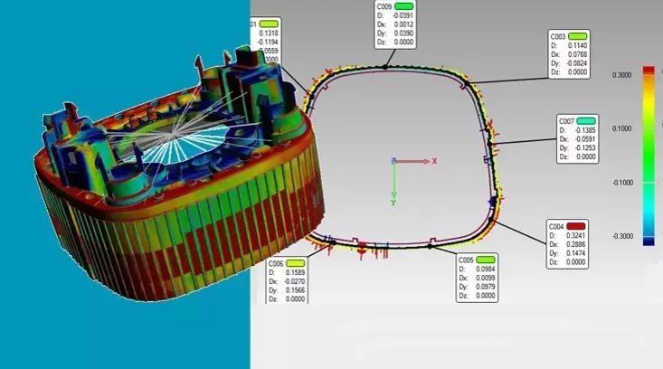 通過點云色差圖反應(yīng)工件全曲面的尺寸形貌。如下圖所示,綠色代表合格區(qū)域,藍色代表負向超差范圍,紅色代表正向超差范圍;同時,也可以出具單個幾何量特征的尺寸信息。