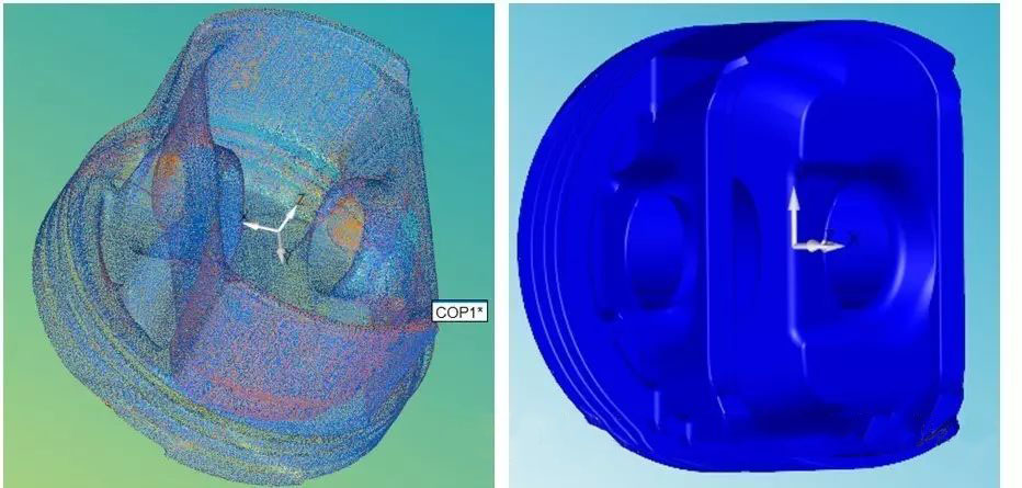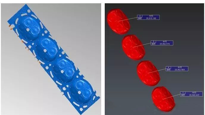 掃描工件型腔(如下圖所示,掃描發(fā)動機缸體燃燒室),之后將型腔封裝成實體,利用點云數(shù)據(jù)進行計算,求得型腔容積。
