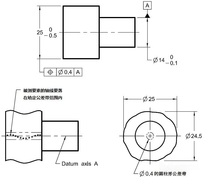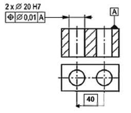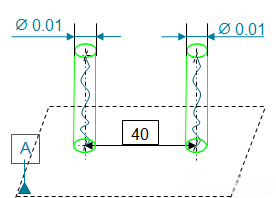 - 對于帶有不完全基準(zhǔn)的陣列要素的位置度,也間接控制陣列要素間的相對位置,如下圖,兩個(gè)孔相對于A基準(zhǔn)的φ0.01的位置度表示的公差帶是兩個(gè)φ0.01的圓柱形公差帶,公差帶軸線互相平行,距離為40,且垂直于A基準(zhǔn);