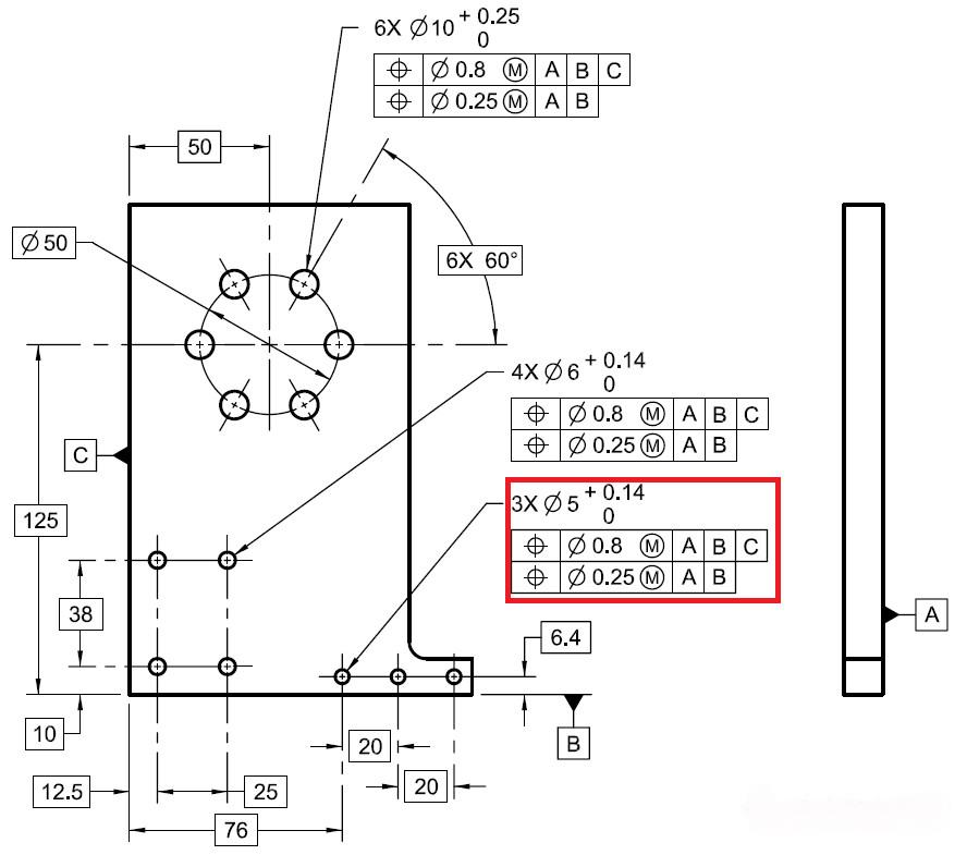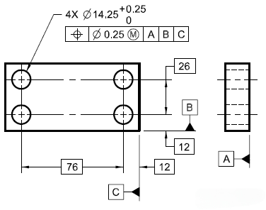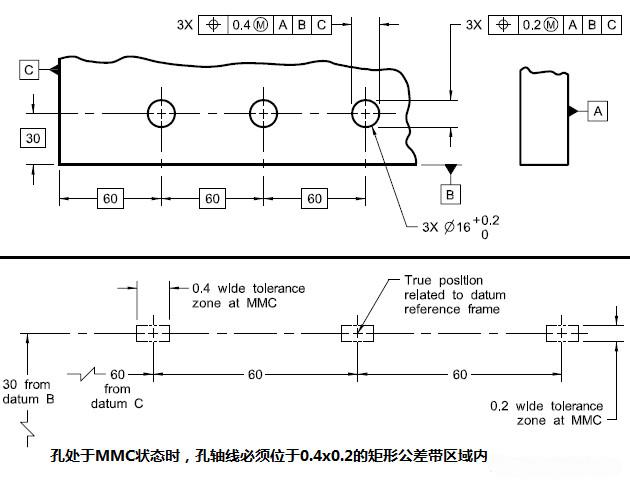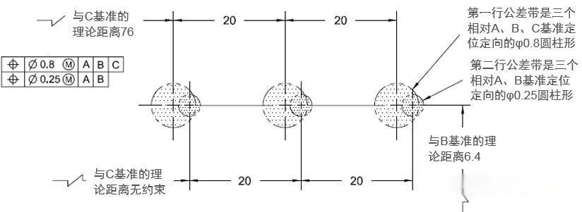 復(fù)合位置度是ASME Y14.5標(biāo)準(zhǔn)的規(guī)定,如下示例: