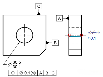 位置度公差定義了一個(gè)尺寸要素的中心點(diǎn)、軸線或中心面允許偏離理論理論位置的區(qū)域(公差帶),可用MMC(最大實(shí)體原則),LMC(最小實(shí)體原則)、RFS(獨(dú)立原則)修正符。