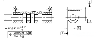 - 復(fù)合位置度的第二行,也控制被測要素間的相對位置度。如下圖,該復(fù)合位置度第二行表示控制4個(gè)同軸孔的相對位置度。公差帶是一個(gè)φ0.15的圓柱形,4個(gè)被測孔的軸線都位于φ0.15的公差帶內(nèi)才合格;