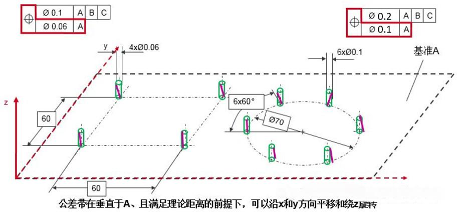 上框格控制“要素陣列”整體的位置和方向公差,即包括旋轉(zhuǎn)和平移自由度,并保證各要素間的相對位置,與傳統(tǒng)位置度的定義完全一致,公差值較大。